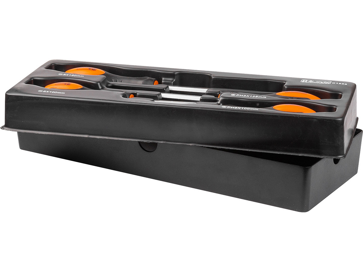 Zestaw 4 wkrętaków ślusarskich umieszczonych we wkładzie do wózka warsztatowego typu A.