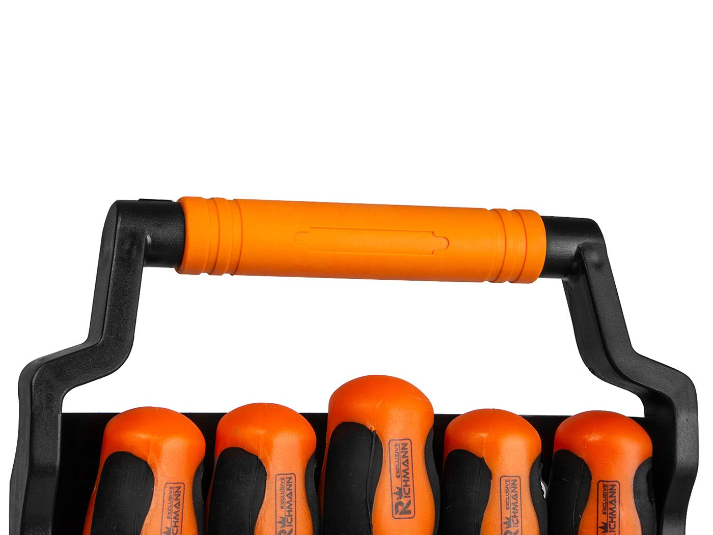 Zestaw zawiera 9 sztuk wkrętaków płaskich oraz krzyżakowych umieszczonych w plastikowej zawieszce.