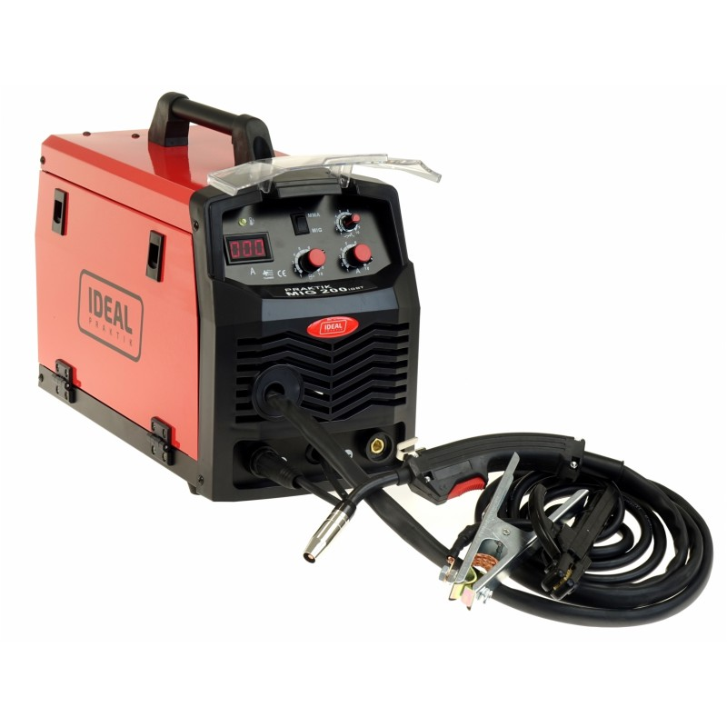 Inwertorowy półautomat spawalniczy do spawania metodą MIG-MAG, MMA oraz FLUX. Prąd spawania 200A. Zasilanie 230V. Średnica drutu spawalniczego 0,6-0,8mm. Podajnik drutu 2-rolkowy