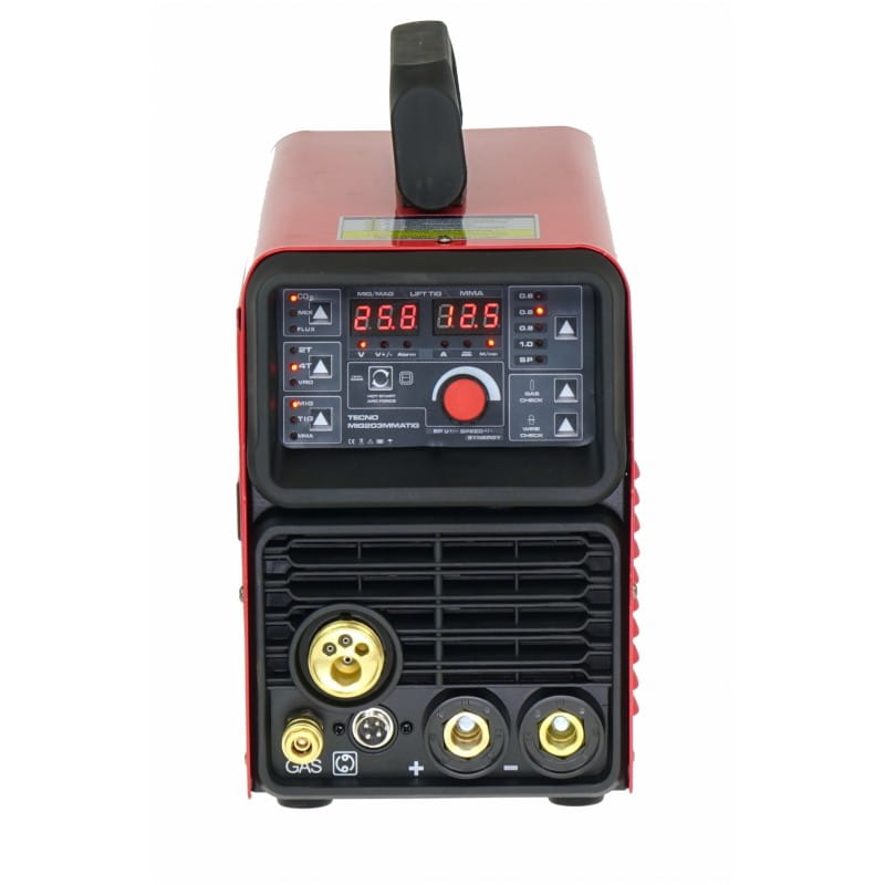 TECNOMIG 203 MIG/TIG/MMA SYNERGIC VRD jest inwertorowym synergicznym półautomatem spawalniczym przeznaczonym do spawania łukowego metodą MIG/MAG, TIG LIFT, MMA oraz FLUX. Urządzenie zostało zaprojetowane do szerokiego zakresu zastosowań: od prac konserwacyjnych do napraw nadwozi samochodowych. TECNOMIG 203 stosowany jest do lutospawania blach ocynkowanych, spawania stali nierdzewnej, stali węglowych i niskostopowych oraz aluminium . Spawanie odbywa się w osłonie gazu obojętnego, aktywnego bądź mieszanki, oraz przy odwrotnej biegunowości bez gazu. Przy metodzie MIG/MAG mamy możliwość wyboru funkcji przycisku w uchwycie pomiędzy pracą w trybie 2T(bez blokady przycisku)/4T(blokada przycisku do długich spoin) Przy metodzie MMA mamy mozliwość włącznia funkcji VRD  (VOLTAGE REDUCTION Device) - redukuje napięcie spoczynkowe stanu jałowego na elektrodzie do wartości bezpiecznej. Zapewnia bezpieczeństwo przeciporażeniowe podczas pracy w wilgotnym środowisku. Urządzenie posiada układ chłodzenia wentylatorem co zdecydowanie zwiększa jego wydajność. Urządzenie wyposażone jest w zabezpieczenie przeciw przeciążeniu, co zwiększa jego niezawodność. Zasilanie jednofazowe. Urządzenie jest wyposażone we wtyczkę zasilania.