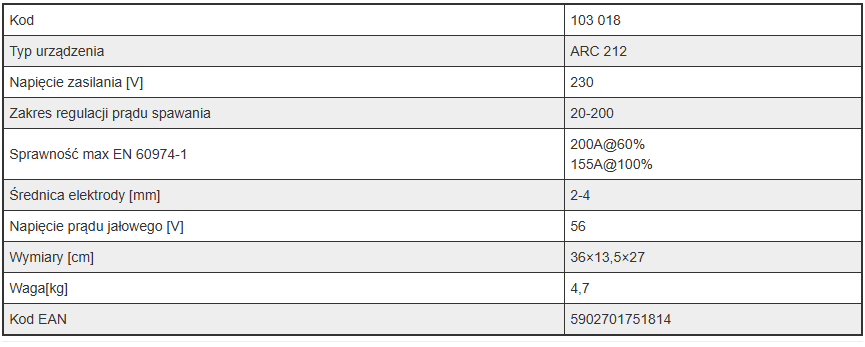 Spawarka ARC 212 wykonana w technologii IGBT jest przeznaczona do spawania metodą MMA i TIG DC SCRATCH stali węglowych, stopowych, nierdzewnych, kwasoodpornych, odlewów żeliwnych oraz aluminium. Spawarka posiada funkcję HOT START (gorący start), ARC FORCE (ciśnienie łuku) oraz ANTI-STICK (zapobieganie przyklejaniu).