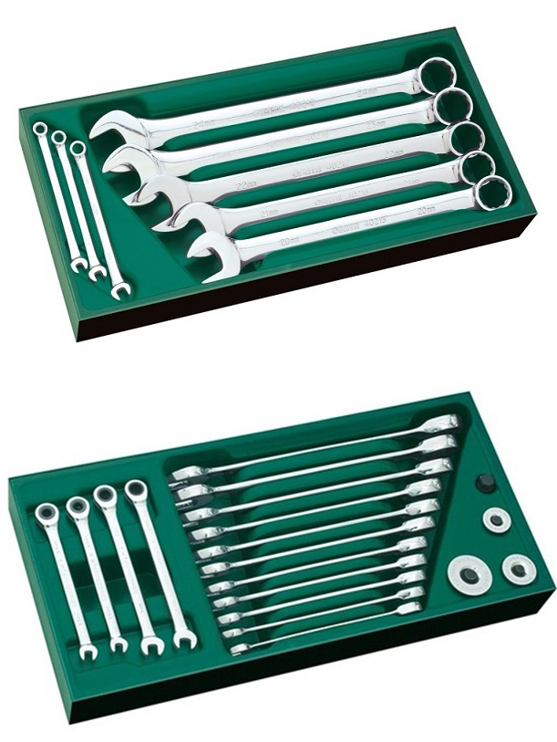 - klucze oczkowe odgięte: 6 × 7, 8 × 10, 10 × 12, 11 × 13, 12 × 14, 14 × 17, 17 × 19, 19 × 21, 21 × 23, 24 × 27