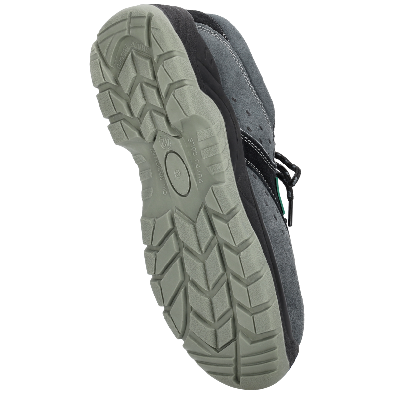 Kolejnym elementem wykonanym z myślą o poprawie bezpieczeństwa jest poliuretanowa podeszwa. Zastosowano tu dwustopniowy wtrysk poliuretanu, aplikując miękkie PU spieniony od wewnętrznej części, a lity w miejscu kontaktu z podłożem. Dzięki temu podeszwa jest trwała, odporna na przecięcie i ścieranie, a jednocześnie elastyczna. Materiał wpływa też na właściwości olejoodporne i antyelektrostatyczne, a podeszwa ma wysoki poziom antypoślizgowości nawet na mokrych nawierzchniach.