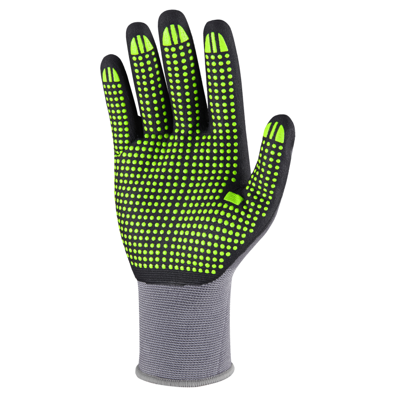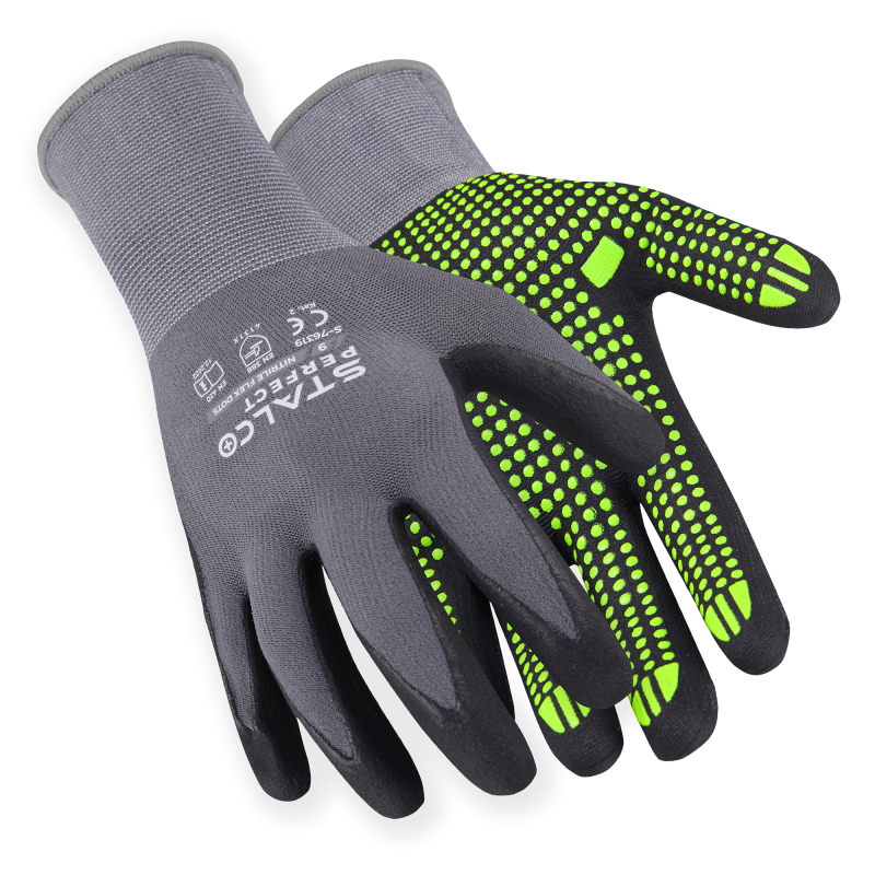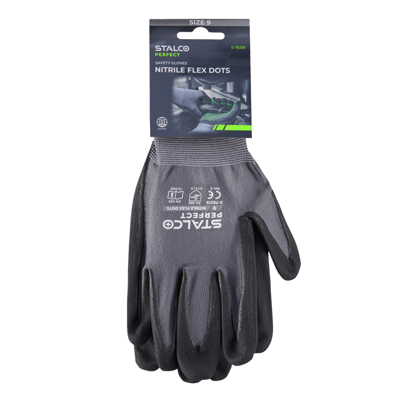 Charakterystyczną cechą rękawic nylonowych Nitrile Flex Dots STALCO jest dodatkowa antypoślizgowa powierzchnia. Uzyskano to poprzez uformowanie niewielkich wypustów na powłoce nitrylowej. Dzięki zastosowaniu innowacyjnej technologii wykonania cała powłoka jest bardzo trwała i odporna na ścieranie. Rękawice można stosować wielokrotnie przy zadaniach wymagających pewnego chwytu. Rękawice oferowane są we wszystkich standardowych rozmiarach.
