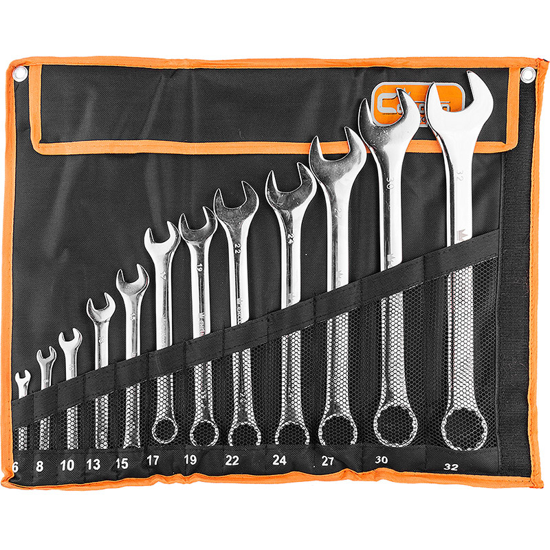 Zestaw 12 sztuk kluczy płasko-oczkowych w zakresie rozmiarów: 6 - 32 mm.