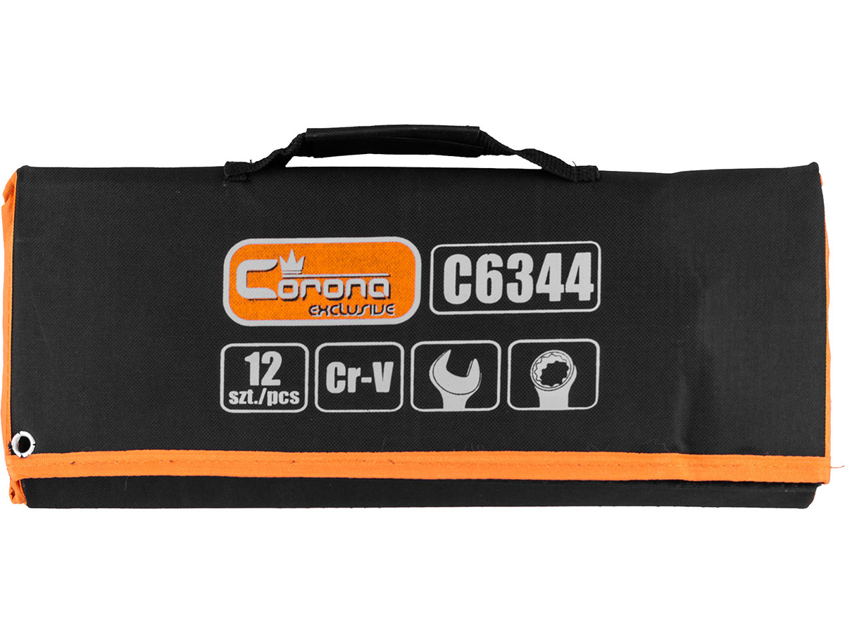 Zestaw umieszczony w sztywnej płachcie transportowej zapinanej rzepem z wydzielonymi miejscami na każdy klucz oraz rączką transportową.