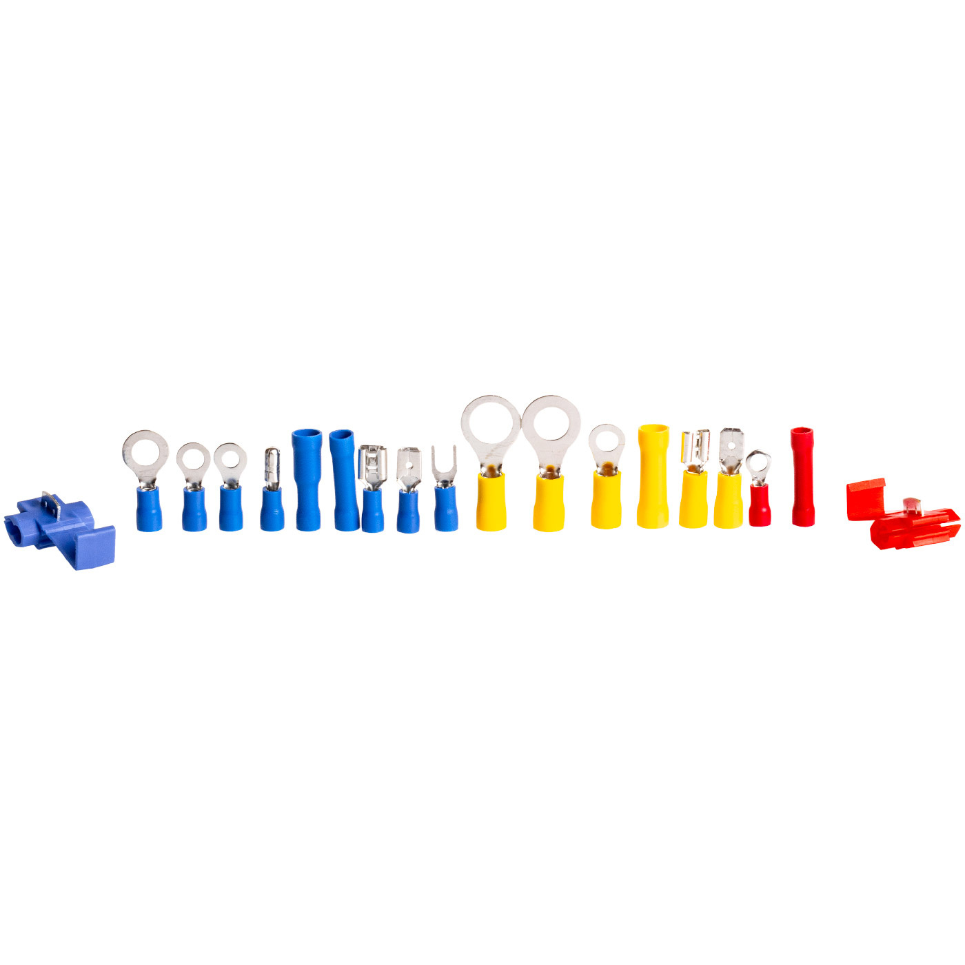 W zestawie znajdują się między innymi izolowane konektory, nasuwki, wsuwko - nasuwki, oczkowe, cylindryczne, widełki, łączniki.