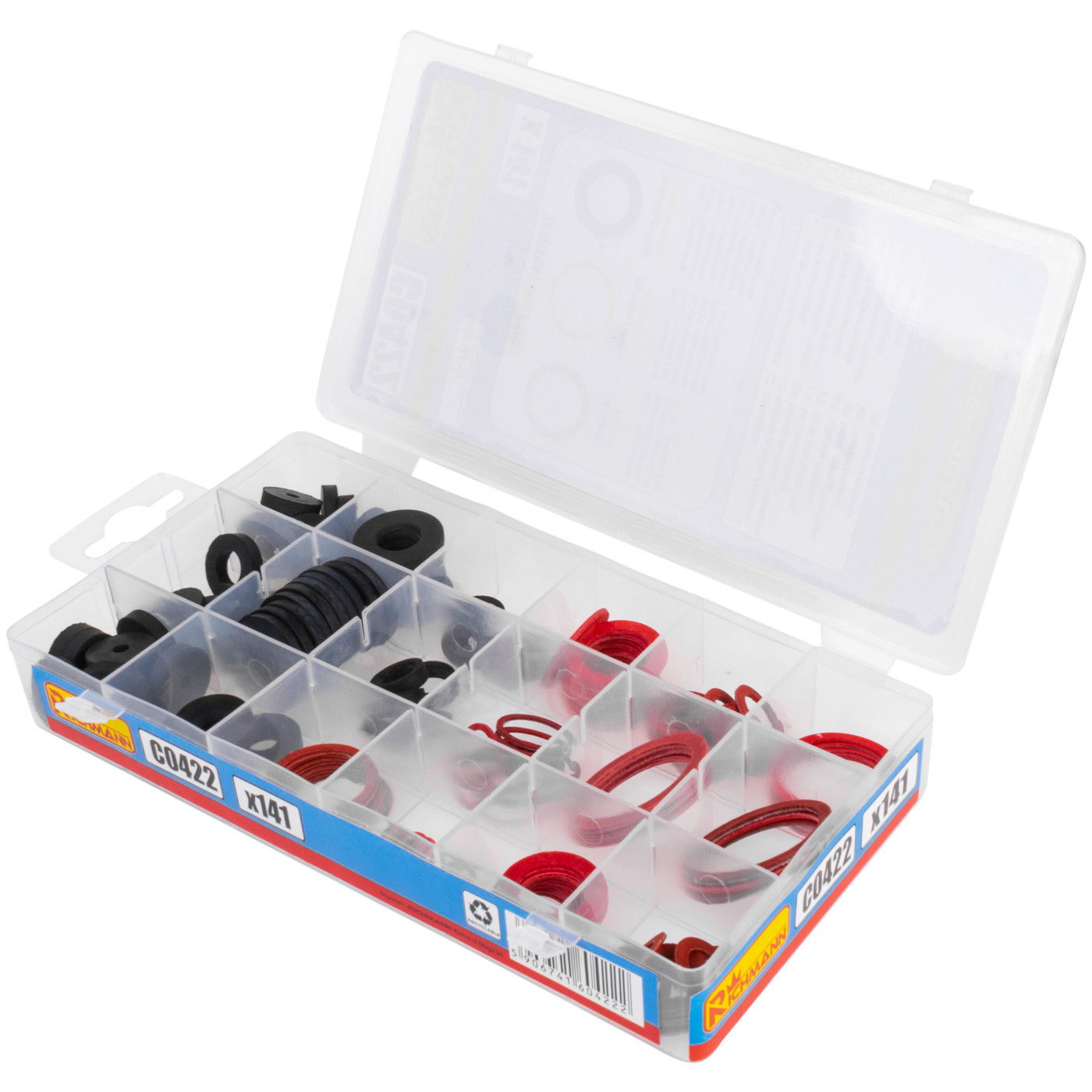 Zestaw 141 sztuk uszczelek sanitarnych w różnych rozmiarach.