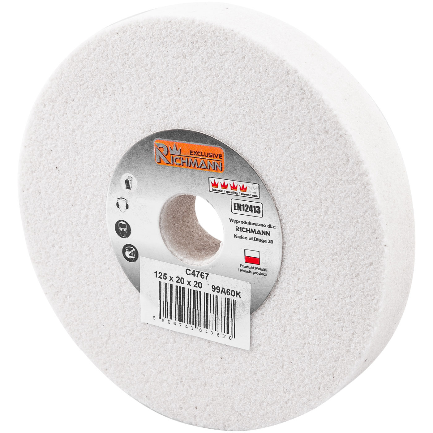 Ceramiczna tarcza szlifierska biała o wymiarach 125 x 20 x 20 mm.