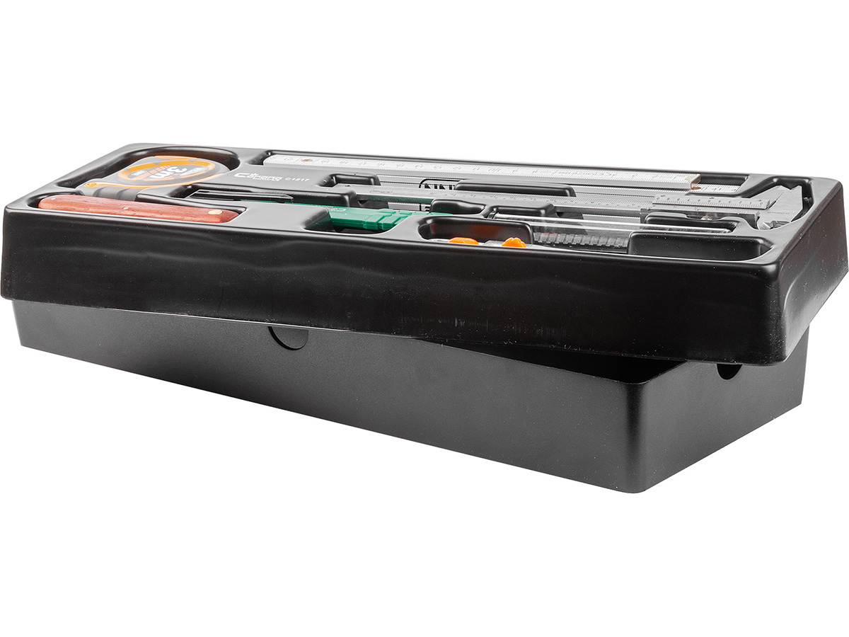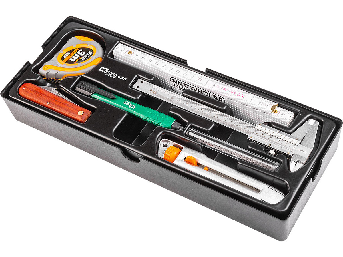 Zestaw akcesoria do pomiaru, zaznaczania i cięcia umieszczone we wkładzie do wózka warsztatowego typu A.
