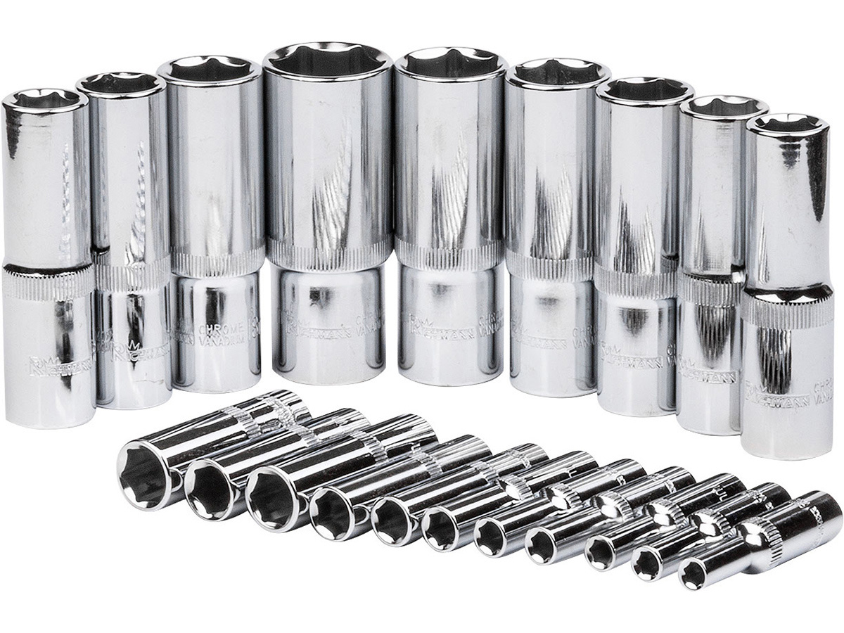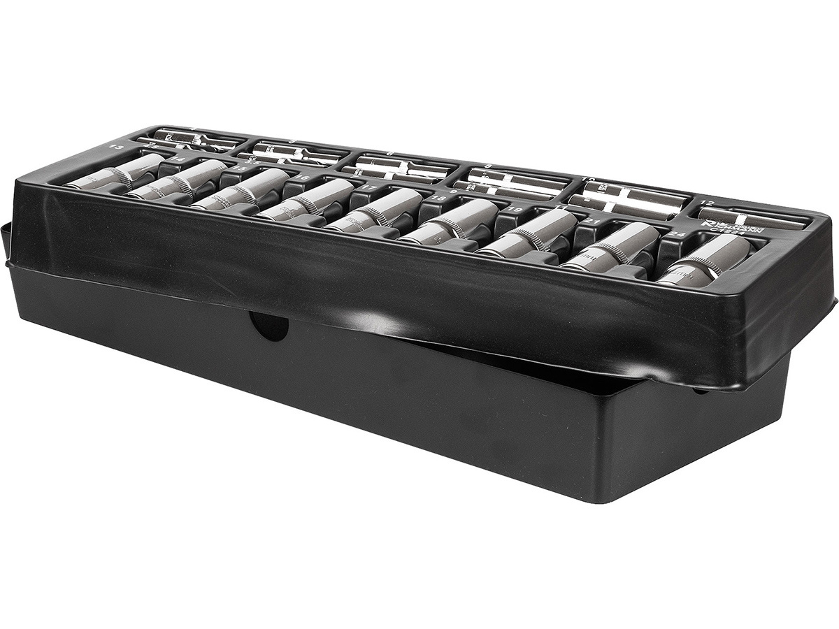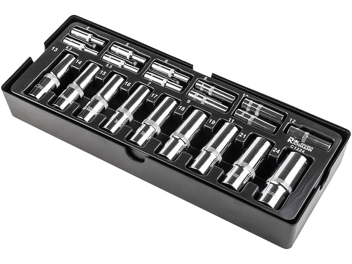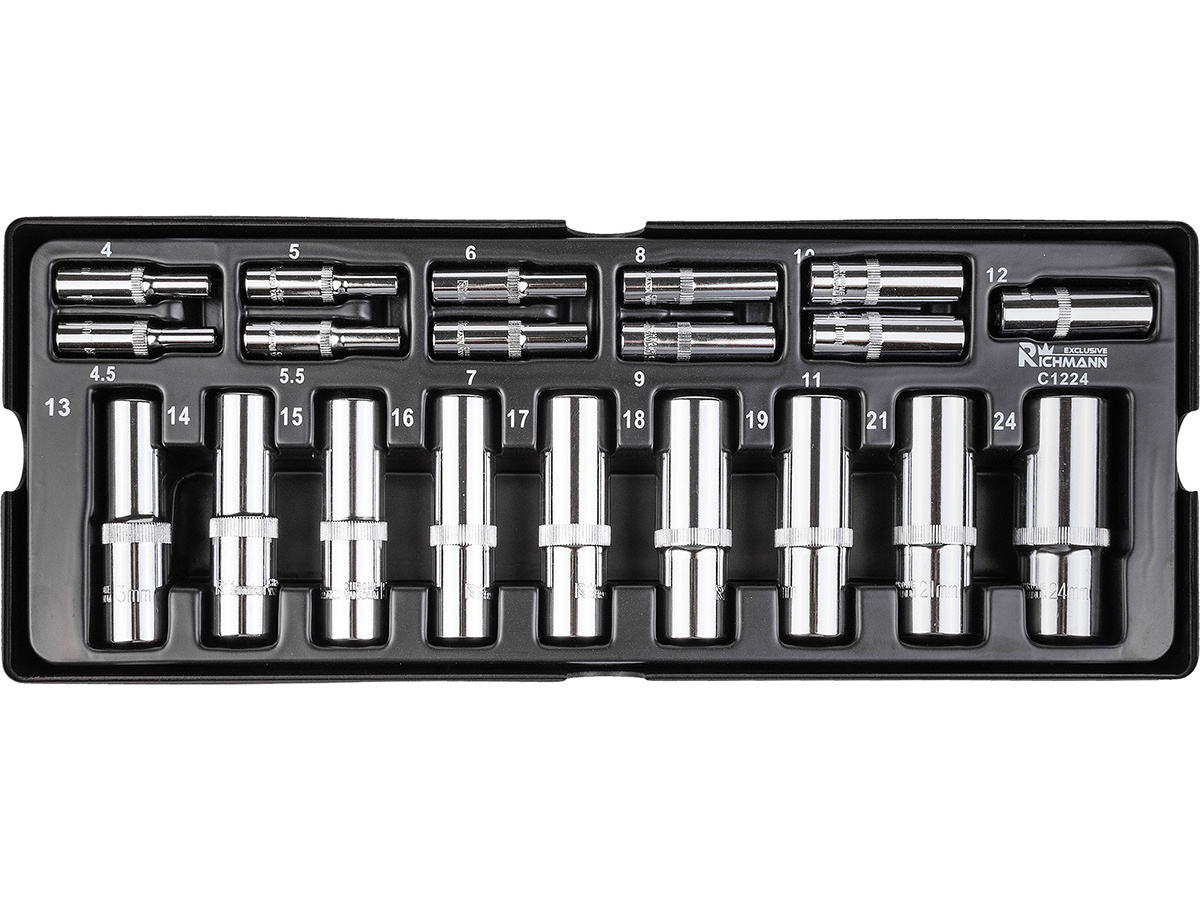 Zestaw 20 długich nasadek umieszczonych we wkładzie do wózka warsztatowego typu A.