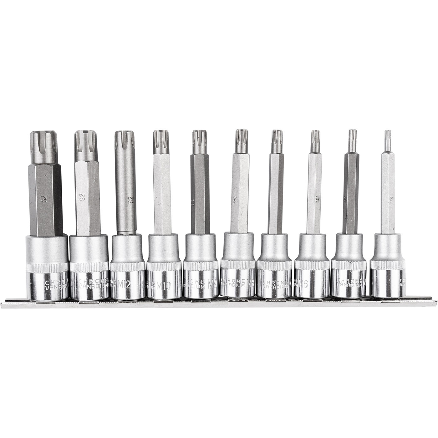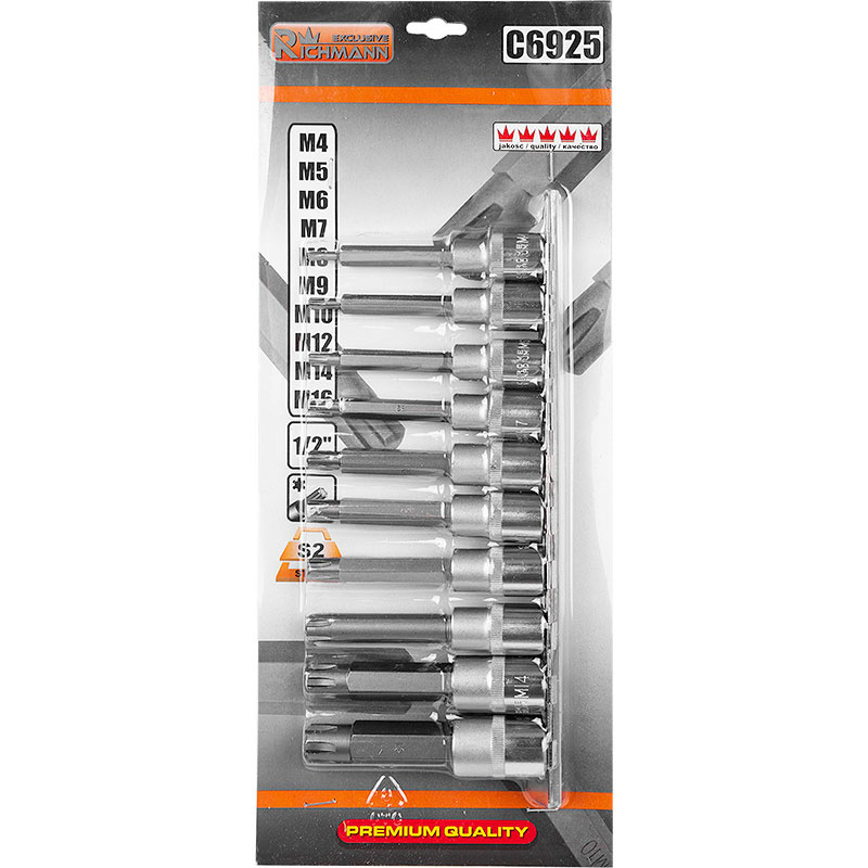 Zestaw 10 sztuk kluczy trzpieniowych RIBE z uchwytem ½” w zakresie rozmiarów M4-M16 umieszczonych na metalowej listwie.