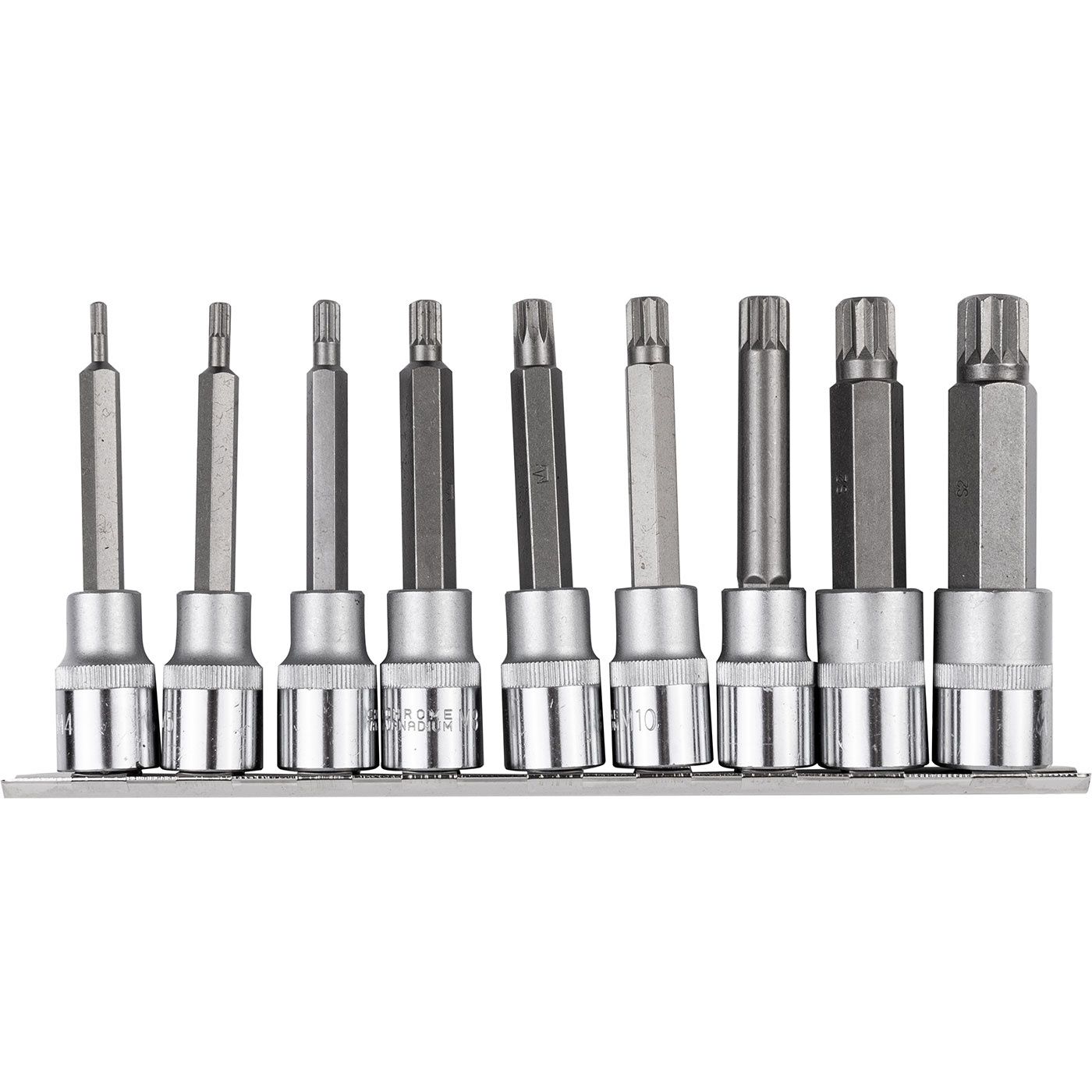 Zestaw 9 sztuk kluczy trzpieniowych SPLINE z uchwytem ½” w zakresie rozmiarów M4-M16 umieszczonych na metalowej listwie.