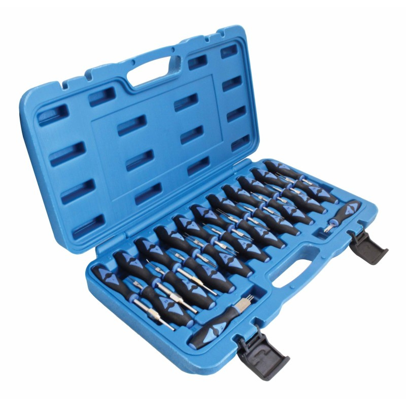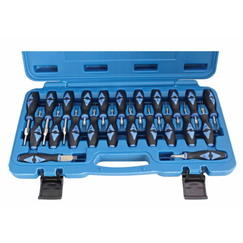 Uniwersalny zestaw zawierający precyzyjne przyrządy do wszystkich okrągłych i płaskich wtyczek prądowych oraz wtyczek spotykanych przy czujnikach, klimatyzacji, systemach ABS, audio itp.