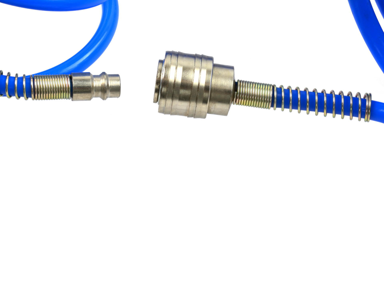 Wąż pneumatyczny spiralny polietylenowy 5x8 mm 10 m Wąż wykonany z polietylenu, dzięki temu jest wysoce elastyczny i jednocześnie trwały. Przeznaczony do stosowania z: pistoletami lakierniczymi pistoletami do przedmuchania pistoletami do mycia i ropowania narzędziami pneumatycznymi Cechy produktu ciśnienie maksymalne 7 bar wąż zakończony szybkozłączkami 1/4" długość węża 10 m wykonany z polietylenu średnica wewnętrzna 5 mm średnica zewnętrzna 8 mm temperatura pracy od -40° C do +70° C