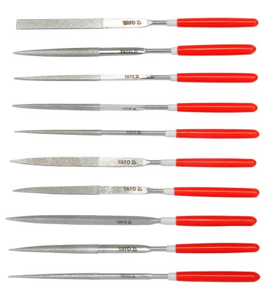 W komplecie pilniki: płaski, płaski zbieżny, owalny, kwadratowy, trójkątny, trójkątny dolny, soczewkowy, nożowy, okrągły, półokrągły.